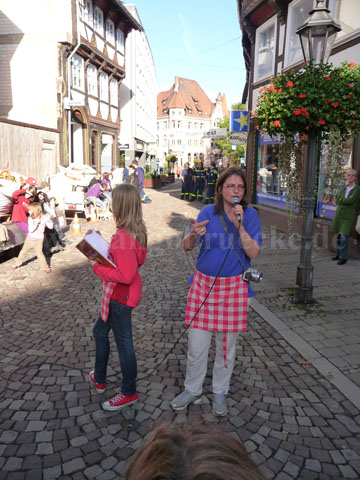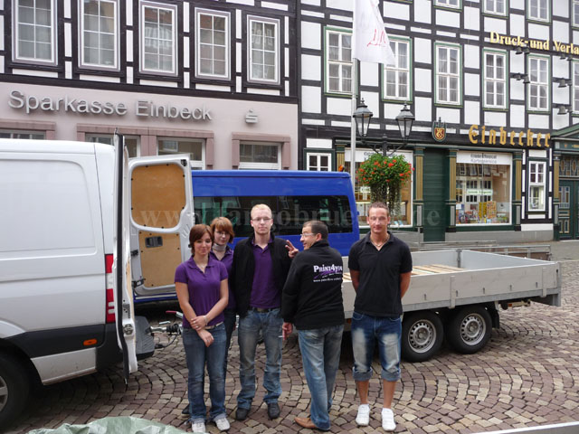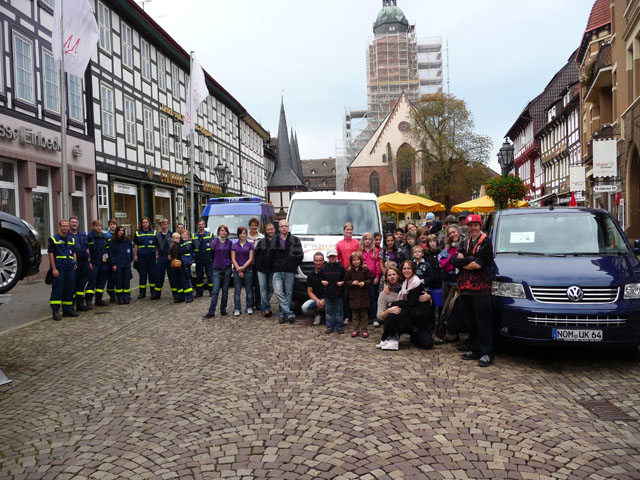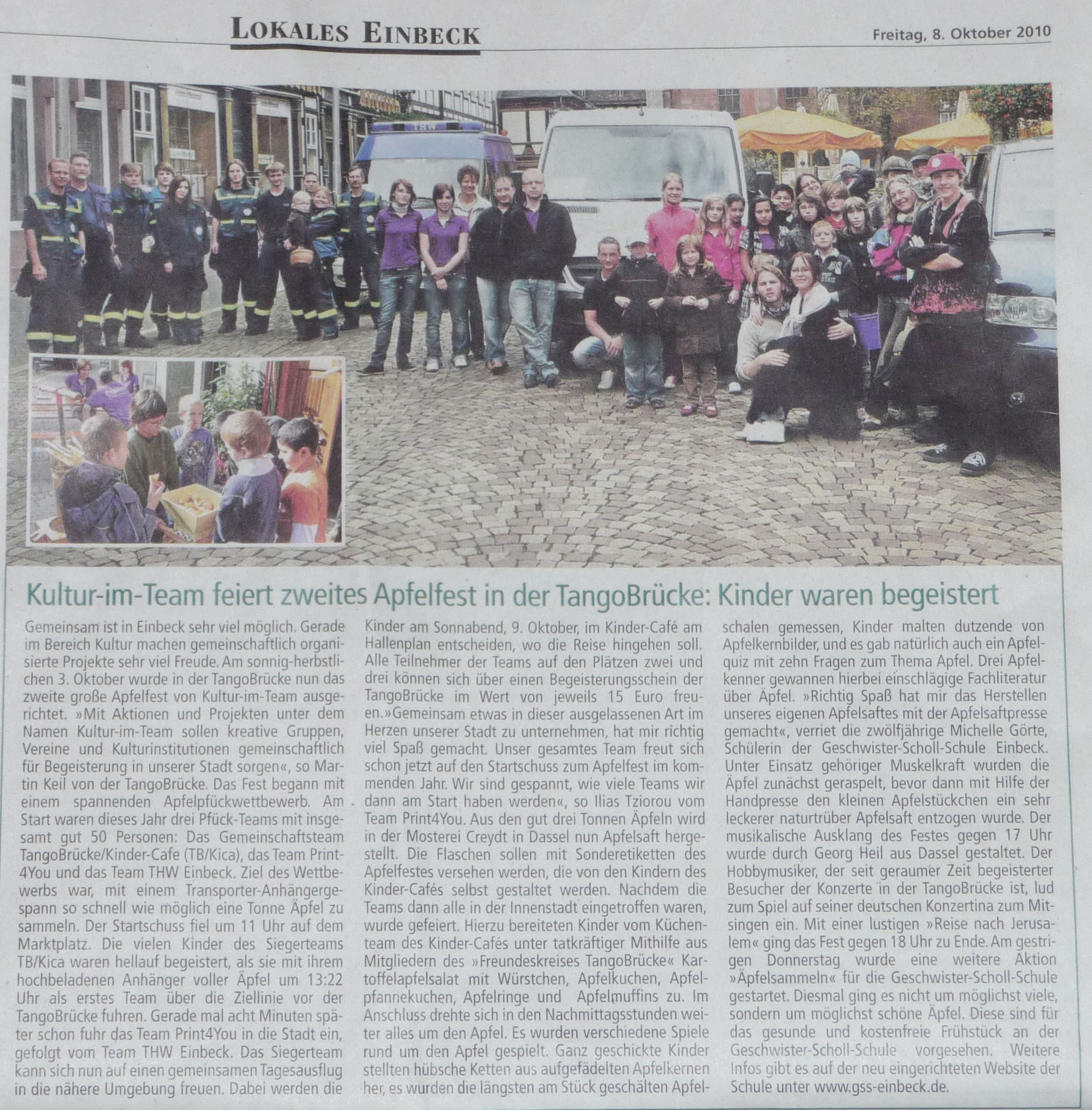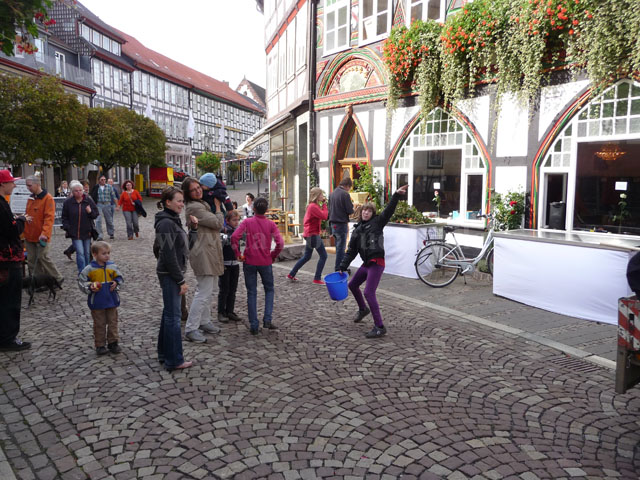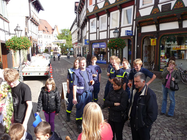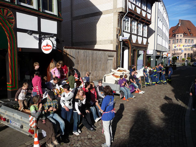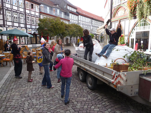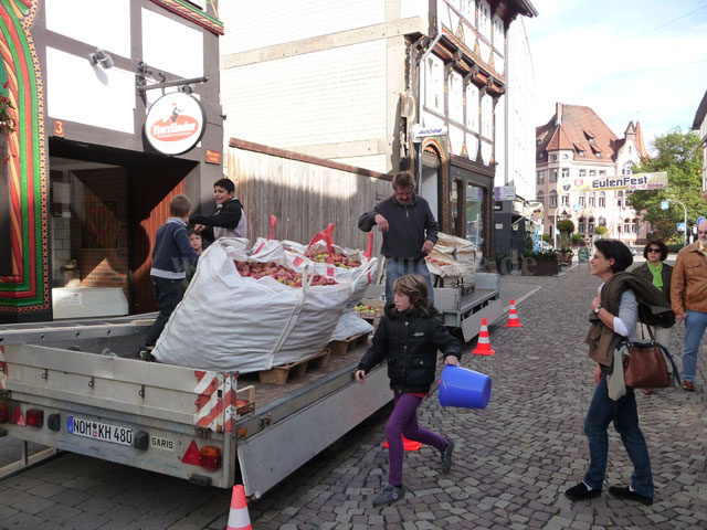 Das Fest begann mit einem spannenden Apfelpfückwettbewerb. Am Start waren dieses Jahr drei Pfück-Teams mit insgesamt gut 50 Personen: Das Gemeinschaftsteam TangoBrücke/Kinder-Cafe (TB/Kica), das Team Print4You und das Team THW Einbeck. Ziel des Wettbewerbs war, mit einem Transporter-Anhängergespann so schnell wie möglich ca. eine Tonne Äpfel zu sammeln. Der Startschuss fiel um 11:00 Uhr auf dem Marktplatz.