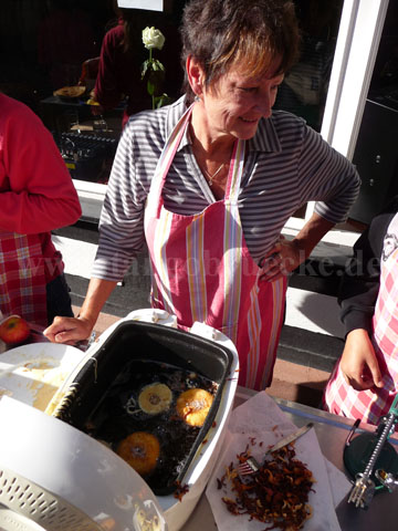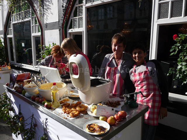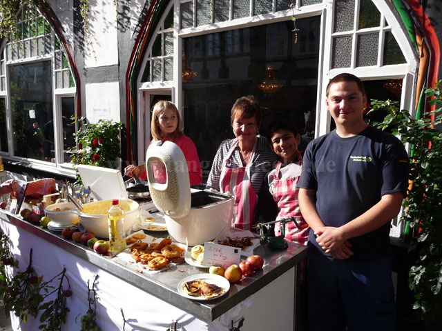 Nachdem die Teams dann alle in der Innenstadt eingetroffen waren, wurde gefeiert. Hierzu bereiteten Kinder vom Küchenteam des Kinder-Cafes unter tatkräftiger Mithilfe aus Mitgliedern des „Freundeskreis TangoBrücke“ Kartoffelapfelsalat mit Würstchen, Apfelkuchen, Apfelpfannekuchen, Apfelringe und Apfelmuffins zu.
