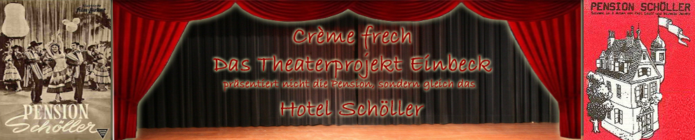 Crème frech ist das Einbecker Theaterprojekt, das inzwischen schon seit Jahren im Kellerfoyer der Realschule zu Gast ist. In diesem Jahr steht die Komödie „Hotel Schöller“ auf dem Programm, die ursprünglich von C. Laufs stammt. Rolf-D. Bartels, Autor, Mitspieler und Regisseur, hat sie gründlich entrümpelt und in die heutige Zeit übertragen. Die Akteure stammen ursprünglich zum großen Teil aus Einbeck und Umgebung, reisen aber inzwischen von weit her zu den Proben und Aufführungen an, so z.B. aus Northeim, Braunschweig, Hannover, Paderborn, Marburg.