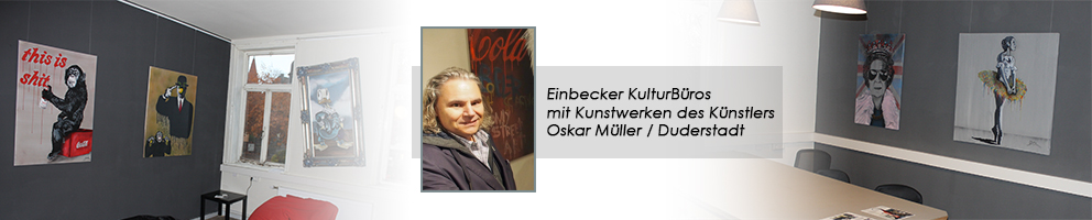 Bei der von den „DenkmalKunst-Aktivisten“ organisierten 5Eck-Erkundungstour nach Duderstadt im Oktober begeisterte Einbecker Kulturaktivisten der Duderstädter Künstler Oskar Müller so sehr mit seinen Werken, dass sie den Künstler unverzüglich dazu einluden, seine Bilder möglichst bald auch in den Einbecker KulturBüros auszustellen. Gesagt - zwei Wochen später bereits getan. Unkompliziert und frisch, wie ihr Schaffer, werden zahlreichen, teils großformatige Werke die Räumlichkeiten des 3eck-Co Working Space in den Einbecker Kulturbüros am Möncheplatz 1 schmücken.